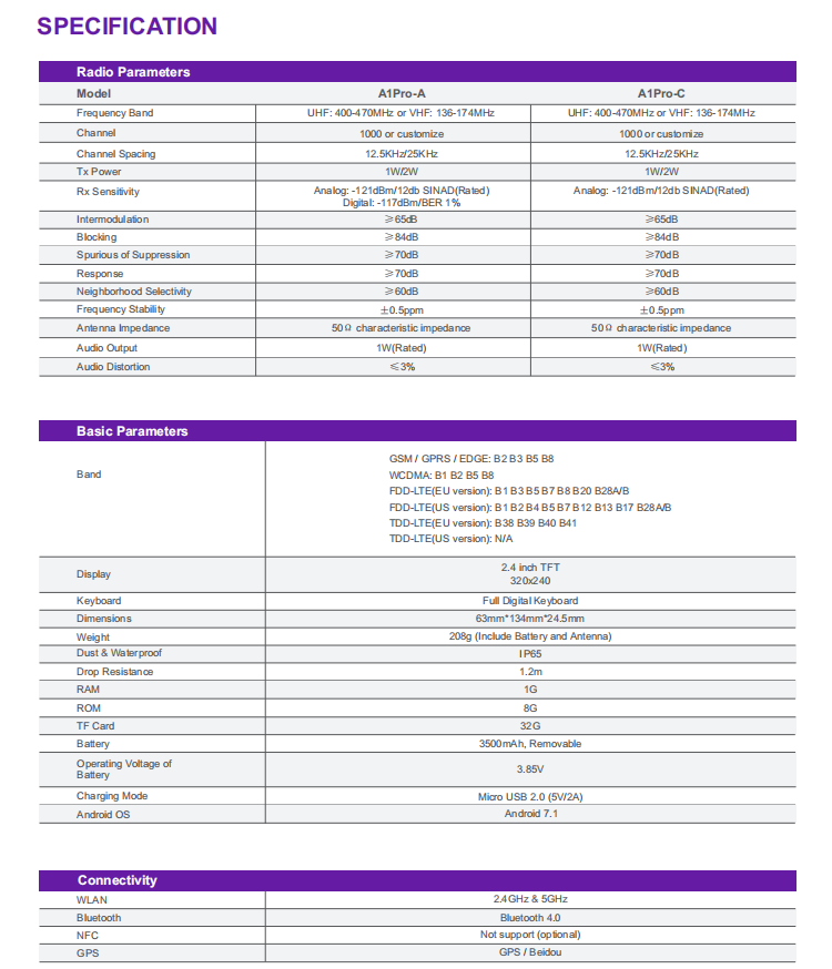 | Rx sensitivity | Analog:-121dBm/12db SINAD(Rated) Digital:-117dBm/BER 1% |